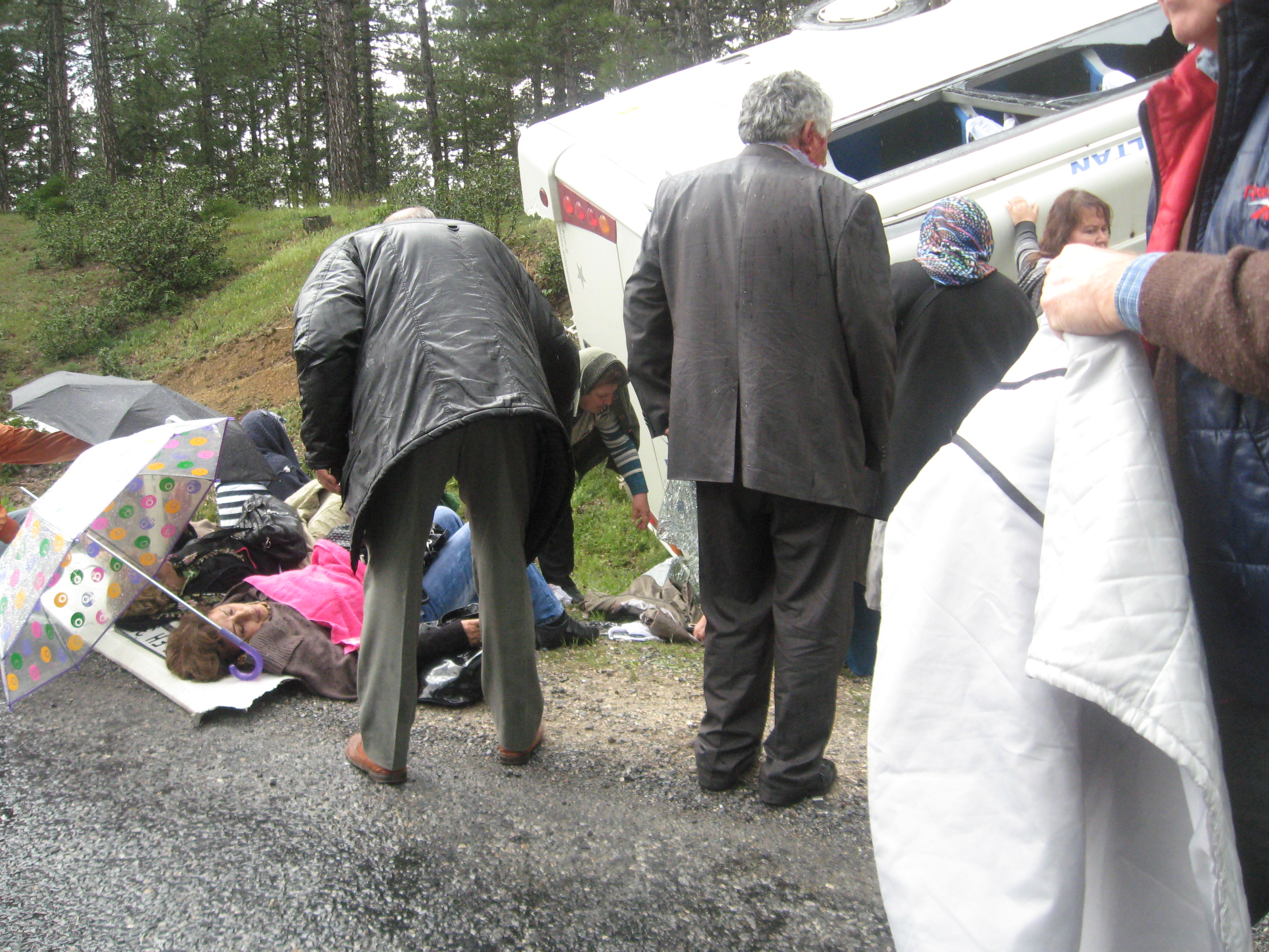 Diğer yolcuların aracın ön ve arka camından çıkarılması çalışmaları başladı hemen. Allahtan hemen orada Hızır gibi yetişen ve kendisinin sağlık personeli olduğunu belirten İstanbul plakalı bir aracın içinden çıkan yeşil tişörtlü sarışın bir bayan bütün bu işlere nezaret etti. Durumu acil olanları sıra ile ve uygun şekilde yere yatırdı. Belki o bayanın belki de bizim Tur sorumlusunun haber vermesi ile yarım saatten daha kısa bir zamanda Simav’dan ve Emet’ten 4 ambulans olay yerine geldi. Durumu acil olanlar üç ambulansla donanım ve diğer imkanları daha iyi olan Simav devlet hastanesine, bizim de içinde bulunduğumuz 5-6 kişiyi de bir ambulansa koyarak Emet devlet hastanesine götürdüler. Eşim Nuray boynunda bir ağrı hissettiği için olay yerinde onun boynunu sabitleştirici bir aygıt takmışlardı. Benim de devrilme esnasında aracın koltuğunun yanında bulunan kolun yan boşluğuma çarpmasından doğan hafif bir ağrı vardı. Hastanenin acil servisinde film falan çekildi. Gelen 5-6 kişinin tamamında ciddi bir şey olmadığını belirttiler. Ağrı kesici ilaç ile zedelenmiş yerler için bir pomat verdiler. Hastaneye gelmiş olan Otel aracı ile de kalacağımız mekana 2 saat gecikmeli olarak gelmiş olduk. Kaza yapmamış olan aracın yolcuları bizden önce gelmişlerdi. Gecenin ilerleyen saatlerinde Simav’a gönderilen yaralılar hakkında bilgi geldi. İki yaralının durumlarını ciddi görerek gerektiğinde ameliyat etmek üzere Kütahya devlet hastanesine gönderildiğini öğrendik. Diğerleri de ufak tefek kırık ve sıyrıkları için gerekli müdahale yapılarak taburcu edilmişti. Bizim için tarifsiz hüzün yüklü bu olay ertesi günkü bazı gazetelerin iç sayfalarında küçük bir haber olarak yer alıyordu.