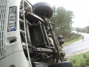 Biz şoförün arkasındaki koltukların üçüncü sırasında oturuyorduk. Herhalde kafalardaki senaryoya göre araba şarampolün kenarından yükselen yamaca bizim bulunduğumuz taraftan 45-50 derece yan yatırılıp durması sağlanacak ve herkes normal bir şekilde aracı terk edecekti. Tabi hiçbir şey düşünüldüğü gibi olmuyor. Aracın direksiyonu şarampole kırılınca bizim taraf önce şiddetle şarampolün yükselen yamacına çarptı daha sonra yüksek hızın ve kaybolan direksiyon hakimiyetinin etkisi ile bu defa ters yöne devrilip ve biraz da sürüklendikten sonra durabildi. Tabi araç içindeki canlı ve cansız her şey bir tarafa savruldu. Ağlamalar, inlemeler,feryatlar birbirine karışıyordu.