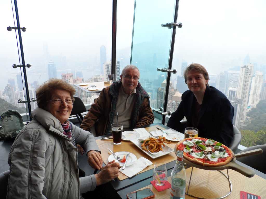 Tapınak ziyaretinden sonra Hong Hong  ziyaretlerinin olmazsa olmazı olarak sayılan bizim seyir tepesi diyebileceğimiz  orijinal ismiyle de Victoria Peak denilen yere gittik. Hong Kong adasının batısında yer alan ve yaklaşık 500 metre yüksekliğindeki bu tepeye yol boyunca yemyeşil ormanlığı ve deniz manzarasını seyrede seyrede  taksi ile gittik. Tabi buraya otobüs ve finüküler sistem gibi ulaşım imkanlarının bulunduğunu da bu arada belirtmek isterim. Hong Kong’u 360 derecelik bir açıdan seyretmek için çıkacağınız terasa tabi ücret ödeyerek çıkıyorsunuz. Biz çıktığımızda hava biraz puslu olmasına rağmen gördüğünüz manzara gerçekten muhteşem ve ödediğiniz ücrete değer diye düşünüyorum.