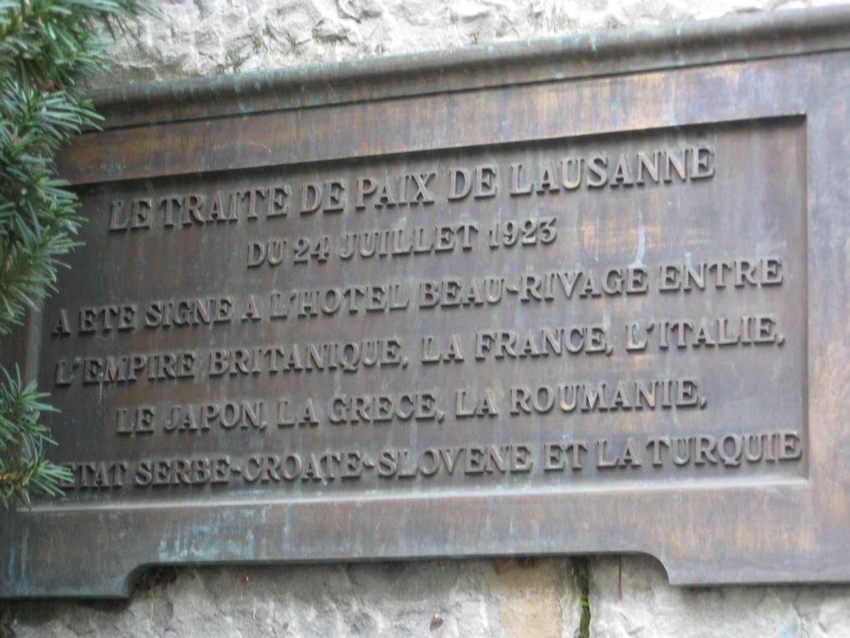 Ancak söz konusu mekana gittiğimizde biraz hayal kırıklığı yaşadığımı belirtmeliyim. Yanlış anlaşılmasın, otel de salon da çok muhteşemdi. Ama bizim için hayat memat meselesi olan olayı hatırlatan resim, yazı ya da objeye rastlamadım. Sadece otelin bulunduğu caddenin karşısındaki bir çam ağacının arkasında ve giderek okunmaz duruma düşen madeni bir levhada ”24 Temmuz 1923 tarihinde İngiltere, Fransa, İtalya, Yunanistan,Romanya, Sırbistan, Hırvatistan, Slovenya ve Türkiye bu otelde toplanmışlardır” şeklinde Fransızca yazan bir metin dışında başkaca bir ize de rastlamadım.