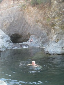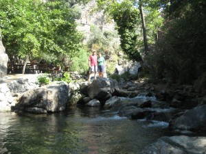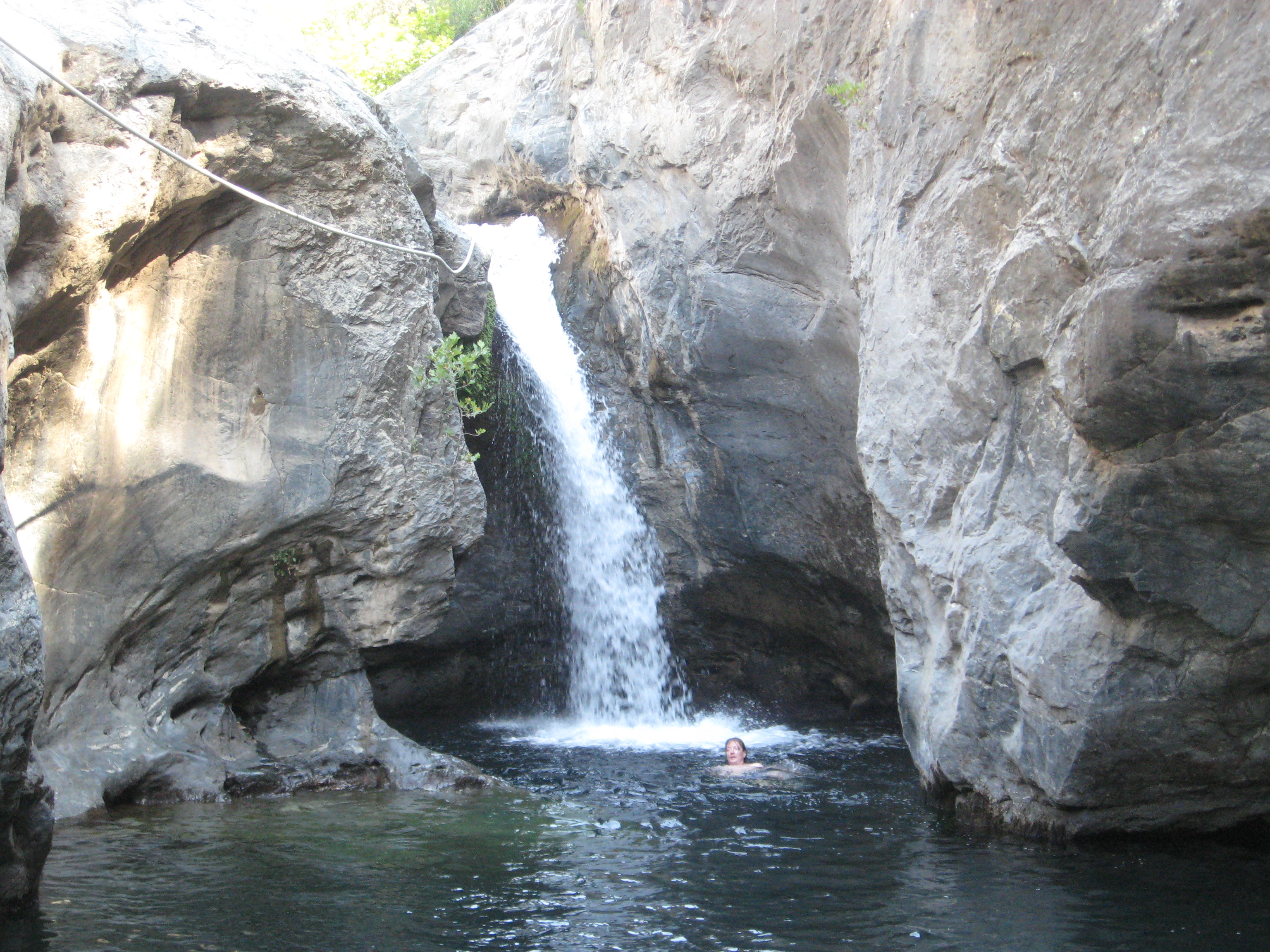 Çayın akışı istikametinde oluşan şelaleyi görebilmek için öncelikle bir dolu merdivenden inmemiz gerekti. Şelalenin bulunduğu yere geldiğimizde öncelikle şelalenin altında ve ilerisinde oluşan göle Gençer ile kendimizi attık. Alıştığımız deniz suyuna göre çok soğuk suda ben fazla kalamadım ama Gençer daha genç ve dayanıklı olduğu için benden daha fazla kaldığı gibi bizzat şelalenin oluştuğu yere kadar da gitmeyi başardı.