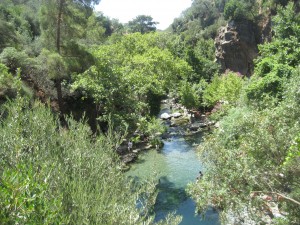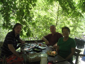Şelalenin soğuk sularında yeterince serinledikten sonra mekanın hazırlanış masalarından birine oturarak kahvaltımızı yaptık. Kahvaltı menüsünde domates,peynir,siyah ve yeşil zeytin,bal,reçel,yumurta, yöreye özel güveçte fırınlanmış domatesli peynir, baharatlanmış zeytin yağı vardı. Tereyağın olmaması dikkatimizi çekip bunu ilgiliye sorduğumuzda “Zeytin yağının olduğu diyarda tereyağını tercih etmiyoruz” gibisinden pek anlam veremediğimiz bir cevap aldık. Nuray ise kahvaltıda peynirli pide yemeyi tercih etti.