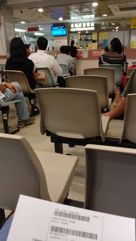 Gittiğimiz hastane Queen Mary Hospital isimli bir devlet hastanesi. Accident & Emergency yazan bölümden içeri girdik. Görüntü bana yabancı gelmedi. Üç aşağı beş yukarı bizim hastanelerin işleyişine benzer bir sistem. 20-25 kadar kişiyi sıralarını bekler bulduk. Uygulamada önce vezneye gidiyorsunuz belli bir ücret yatırıyorsunuz. Burada sosyal güvenliği olsa da bir miktar katkı payı alıyorlar. Bizim öyle bir şeyimiz olmadığı için bizden daha fazla aldılar. (Sanırım 1000 küsür HKD) Daha sonra bizimle bir hemşire görüştü. Tansiyonumu ölçtü. Forma oğlumun tercümanlığı ile bir şeyler yazdı. Ve bize orta acil anlamına gelen ve üzerinde bir kısım yazılarla 4 sayısının yazdığı bir kâğıt verdi ve çağrılmak için beklememizi söyledi. Kâğıtta orta aciliyetin bekleme süresinin 120 dakika olduğu, iş yoğunluğuna göre bu sürenin uzayıp kısalabileceği yazılıyormuş. Neyse bizde herkes gibi beklemeye başladık.