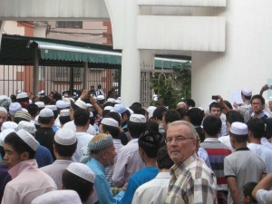 Ertesi gün Tekstil Fuarına gittiğimde orada Şangayda yaşayan Azeri Türkleri ve Uygur Türklerine rastladım. Onlara sorduğumuzda onlar Çinde –ya da Şangayda- bayramın 31 Ağustos tarihinde olduğunu ve bayram namazı vaktinin de saat 8.30-9.00 arası olarak belirttiler. Belirtilen tarihte ve saatte oğlumla birlikte camiye gittik. Zaten küçük olan caminin hemen her bölümü dolmuş, yanda trafiğe kapatılan caddeye doğru da genişleme başlamıştı. Biz de cadde üzerinde konuşlanacak yer ararken önceki gün gelip sözlerle anlaşamadığımız kişi ile karşılaştık ve galiba beni tanıdı ve el işareti ile kendisini takip etmemizi söyledi. Bizi caminin kapalı alanında uygun bir yere yerleştirdi. Yani sözler değilse de gözlerle anlaşabilmiştik.