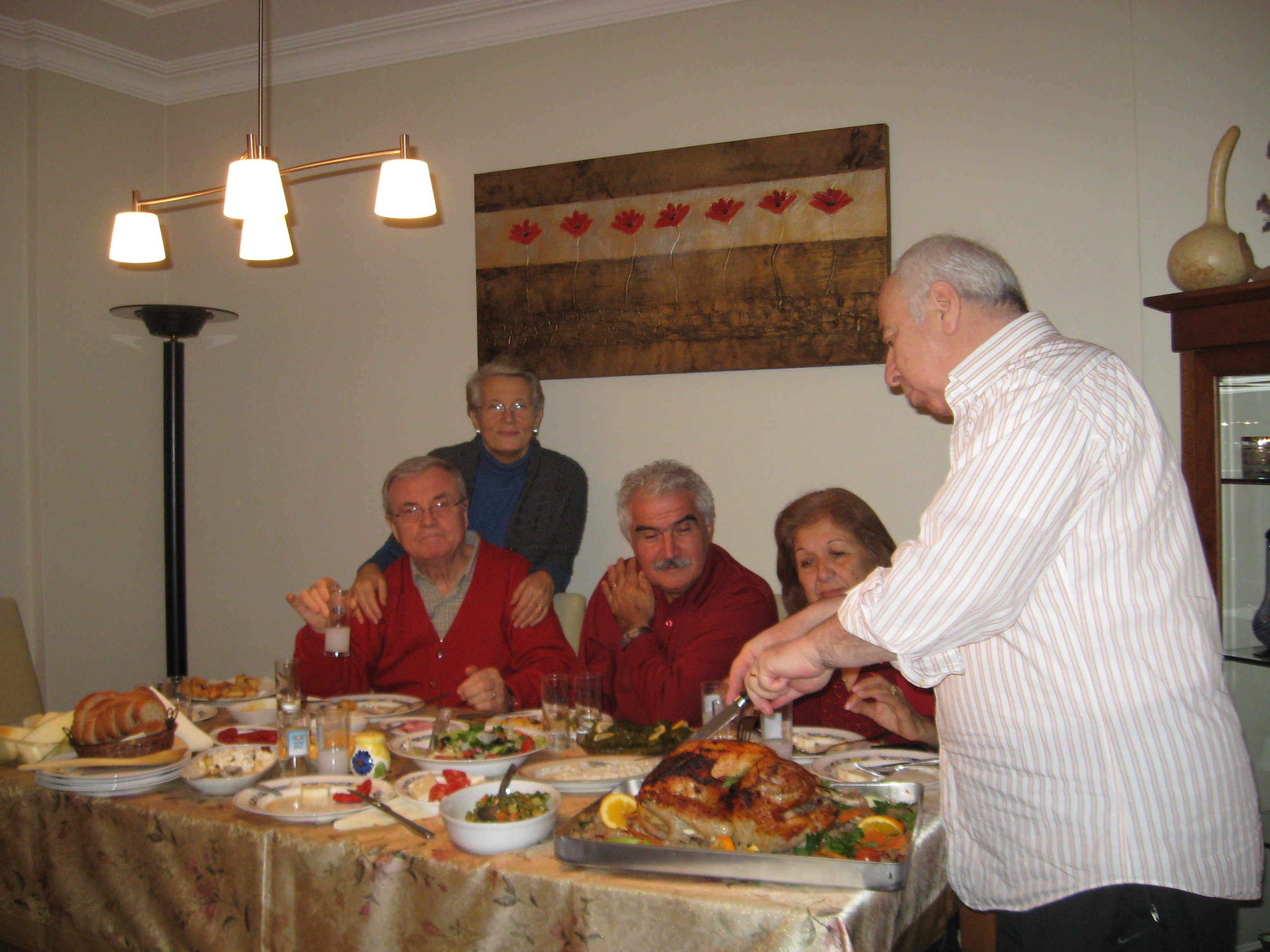 Yılbaşının simgesi olan kırmızı renkli kazaklar.. Masada rakı ve hindi.. Eskimeyen dostlar..Gerçekten güzel bir tablo. Nobel’li yazarımız Orhan Pamuk’a “Mutluluğun romanını yazabilir misin?” diye sorsalar, bu fotoğrafa bakarak yazardı herhalde… Hepinize mutlu yıllar dileriz.