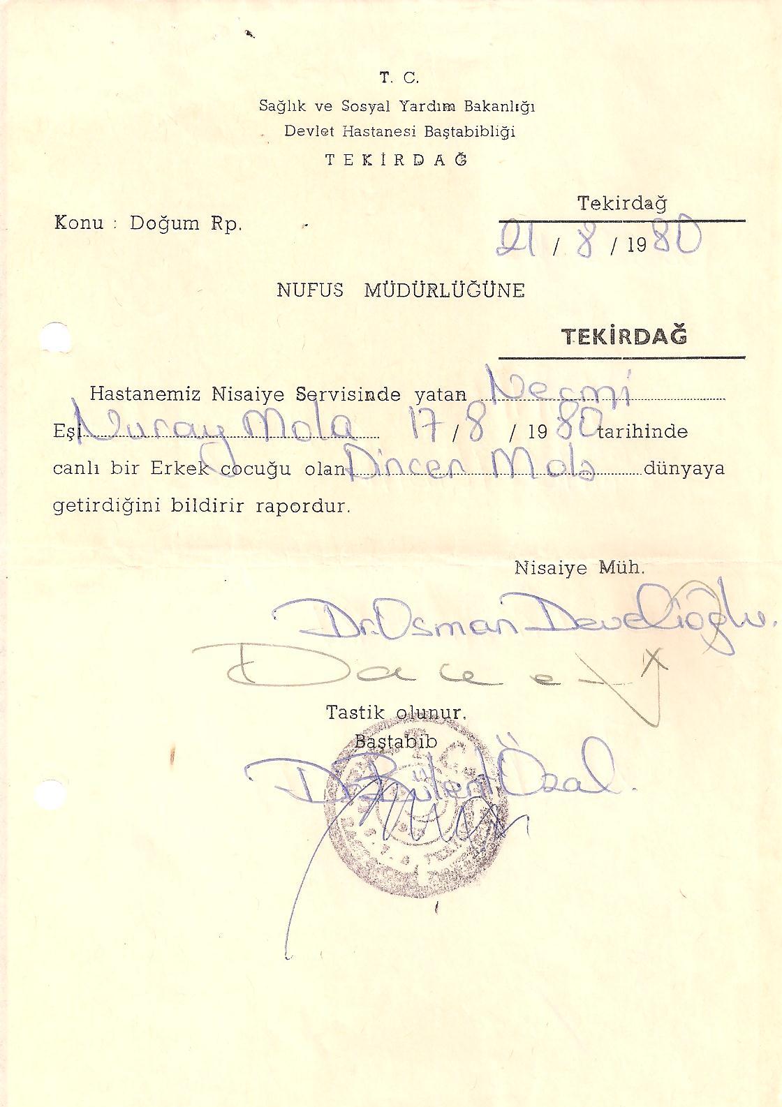 Tekirdağ’da çalıştığımız yılların hemen herkesçe yapılan ortak keyfi, akşamüzeri deniz kıyısına inip sahil boyunca turlamaktı. Bu hem bir gezinti oluyor hem de birçok tanıdık eş dost orada birbirine rastlıyor, yorulunca da bir çay bahçesinde denize karşı çayını yudumluyordu. 1980 yılının 16 Ağustosunda biz de aynı durumu tekrarlamak için sahile inmiştik ve bir iki tur atınca Nuray’ın sancısı başladı. Sahici mi, yalancısı mı, tekrarlıyor mu, tekrarlamıyor mu derken eve gitmenin en doğrusu olduğuna karar verdik. Evde de sancılar tekrarlamaya başlayınca herhalde hastaneye gitme vakti geldi diye düşündük. Böyle durumlarda sanki doğuracak benmişim gibi daha fazla paniklerim. O zaman da öyle oldu. Bavul eşya falan filan derken elim ayağım birbirine karışıyordu. Hava kararmadan biz hastaneye gelmiştik. Ben hemen Muratlı’ya giderek annemi de hastaneye getirdim. Hastanelerde insan böylesi durumlarda bir tanıdık yüz arıyor hep. Öyle bir aksilik ki ne zaman zaman muayene olup kontrolleri yapan kadın doğumcu doktora ne de üst katımızda oturan ve hastanede ebe olarak çalışan komşumuza bir türlü ulaşamadık.
